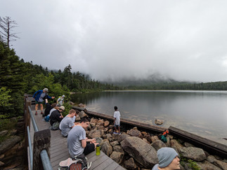 We woke up to rain on Tuesday and decided the best move was to get outside. We drove up to Franconia Notch and hiked the Lonesome Lake Trail up, fishing poles in hand! The lake was beautiful in the fog and we enjoyed making echoes across the water at another youth group. We had eaten our lunch on a bridge at the lake and watched as a diver bobbed around collecting trash in the lake. Lucky for us, this diver was a crew member at the hut and was available to give a tour once out of the water. Pierce from the AMC explained the history of Lonesome Lake as a fishing camp, advised us on the best area to fish, and talked about how goods get to-and-from the remote hut (and how a helicopter drops fish into the lake to restock it with trout!) Seeing the hut got us excited for our stay at Cardigan's high cabin and we 'left our mark' in the logbook on 7/23/24, and handed a thank-you card to Pierce. The weather cleared as we drove out of the Notch and we enjoyed better views before a delicious dinner on Mayhew Island and hiding some gnomes for island boys. After dinner we approached the dock to return to the mainland and a Link spotted a pile of wood perhaps 6 feet tall, 12 feet wide. Continuing their theme of embracing challenge, the group decided independently to take on what they called a "super work hour," spending two hours carrying the wood in a fireline to the boat, ferrying it to the mainland, carrying it off the boat and piling it neatly.
